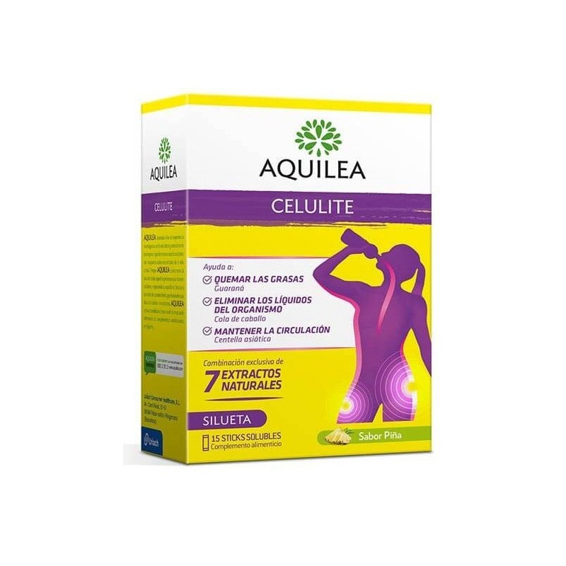 AQUILEA CELULINA:- STICKS BEBIBLES.- CONTRIBUYE A LA ELIMINACIÓN DE LAS GRASAS.- AYUDA A LA CIRCULACIÓN Y REDUCCIÓN DEL VOLUMEN CORPORAL.- INDICADA PARA PERSONAS QUE QUIERAN DISMINUIR LA CELULITIS O AYUDAR EN LA CIRCULACIÓN Y LA RETENCIÓN DE LÍQUIDOS.- SIN AZÚCAR AÑADIDO.INGREDIENTES ACTIVOS POR DOSIS DIARIA: COLA DE CABALLO (67,5 MG), ULMARIA (54 MG), RABOS CEREZA (22,5 MG), VID (16,67 MG), CENTELLA ASIÁTICA (100 MG), GUARANÁ (180 MG), TÉ VERDE (75 MG).LOS COMPLEMENTOS ALIMENTICIOS NO DEBEN UTILIZARSE COMO SUSTITUTOS DE UNA DIETA VARIADA Y EQUILIBRADA Y DE UN MODO DE VIDA SANO. NO RECOMENDADO A MENORES DE 12 AÑOS. NO RECOMENDADO DURANTE EL EMBARAZO Y/O LACTANCIA. NO CONSUMIR DURANTE UN PERÍODO DE TIEMPO PROLONGADO SIN ANTES CONSULTARLE A SU MÉDICO O FARMACÉUTICO. NO RECOMENDADO EN CASO DE TRATAMIENTO CONCOMITANTE CON DIURÉTICOS. CONSULTE A SU MÉDICO O FARMACÉUTICO EN CASO DE ENFERMEDAD CARDÍACA. CONTIENE CAFEÍNA: CONTENIDO EN CAFEÍNA (20,55 MG/STICK). NO SOBREPASAR LA CANTIDAD DIARIA RECOMENDADA. CONSERVAR EN LUGAR FRESCO Y SECO, PROTEGIDO DE LA LUZ SOLAR. MANTENER FUERA DEL ALCANCE DE LOS NIÑOS.