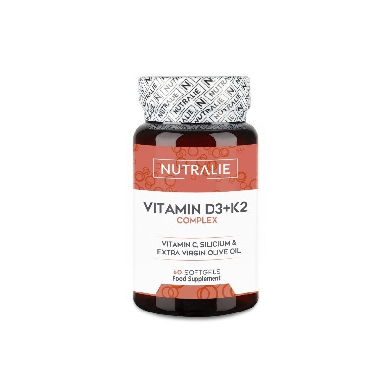 El complemento de Vitamina D3 + K2 Complex de Nutralie se presenta en un envase de 60 cápsulas con recubrimiento vegetal.