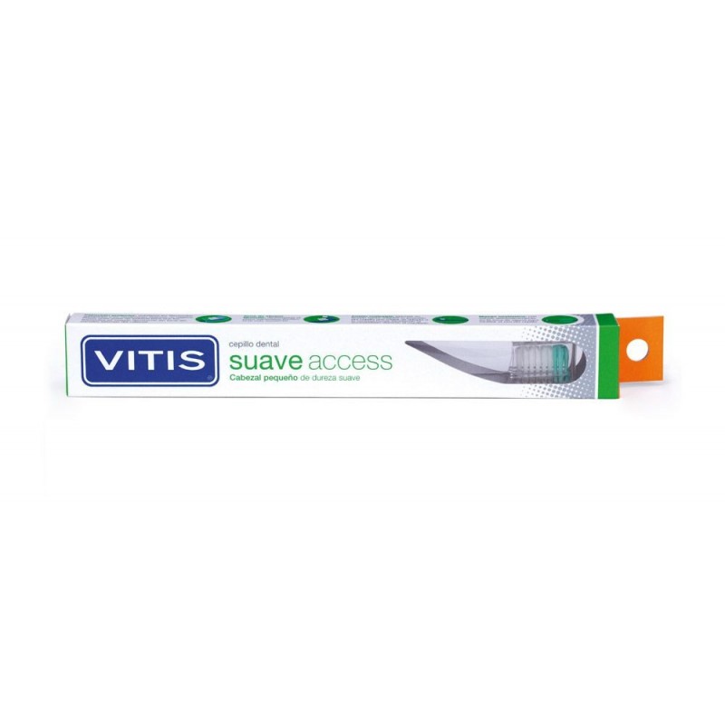 VITIS SUAVE ACCESS CEPILLO DENTAL ES UN CEPILLO DE USO DIARIO CON CABEZAL DE TAMAÑO PEQUEÑO QUE PERMITE ACCEDER FÁCILMENTE A LAS ZONAS POSTERIORES DE LA BOCA Y DISMINUIR LOS POSIBLES REFLEJOS NAUSEOSOS.SUS FILAMENTOS SUAVES Y CON PERFIL ONDULADO ACCEDEN A LOS ESPACIOS INTERDENTALES, A LA VEZ QUE FACILITAN LA LIMPIEZA EN EL CONTORNO DE LAS ENCÍAS