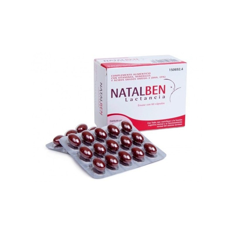 PROPIEDADESNATALBEN LACTANCIA ES EL PRIMER Y ÚNICO COMPLEMENTO VITAMÍNICO CON LA MAYORÍA DE LOS NUTRIENTES ESENCIALES PARA EL PERIODO DE LACTANCIA.NATALBEN LACTANCIA ESTÁ ESPECIALMENTE FORMULADO PARA CUBRIR LAS NECESIDADES DE LA MUJER EN EL PERIODO DE LACTANCIA.CONTIENE ÁCIDO FÓLICO, VITAMINA A, VITAMINA D, YODO, HIERRO, CALCIO Y ÁCIDOS GRASOS OMEGA-3 (DHA Y EPA) EN LAS CANTIDADES ADECUADAS PARA LA MUJER LACTANTE.ADEMÁS, NATALBEN LACTANCIA INCLUYE 100% DE LAS CANTIDADES DIARIAS RECOMENDADAS DE OTRAS VITAMINAS Y MINERALES IMPRESCINDIBLES PARA LA MUJER DURANTE EL PERIODO DE LACTANCIA.NATALBEN LACTANCIA NO CONTIENE SACAROSA, LACTOSA NI GLUTEN.INDICACIONESSE RECOMIENDA TOMAR DOS CÁPSULAS AL DÍA.NATALBEN LACTANCIA ES EL COMPLEMENTO ESENCIAL DURANTE EL PERIODO DE LACTANCIA.