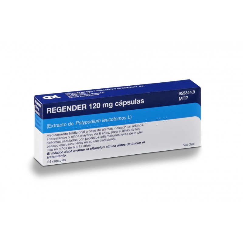 Regender 120mg 24 Cápsulas contiene extracto seco de rizoma de Polypodium leucotomos L, este componente es conocido por sus beneficios antiinflamatorios y fotoprotector.