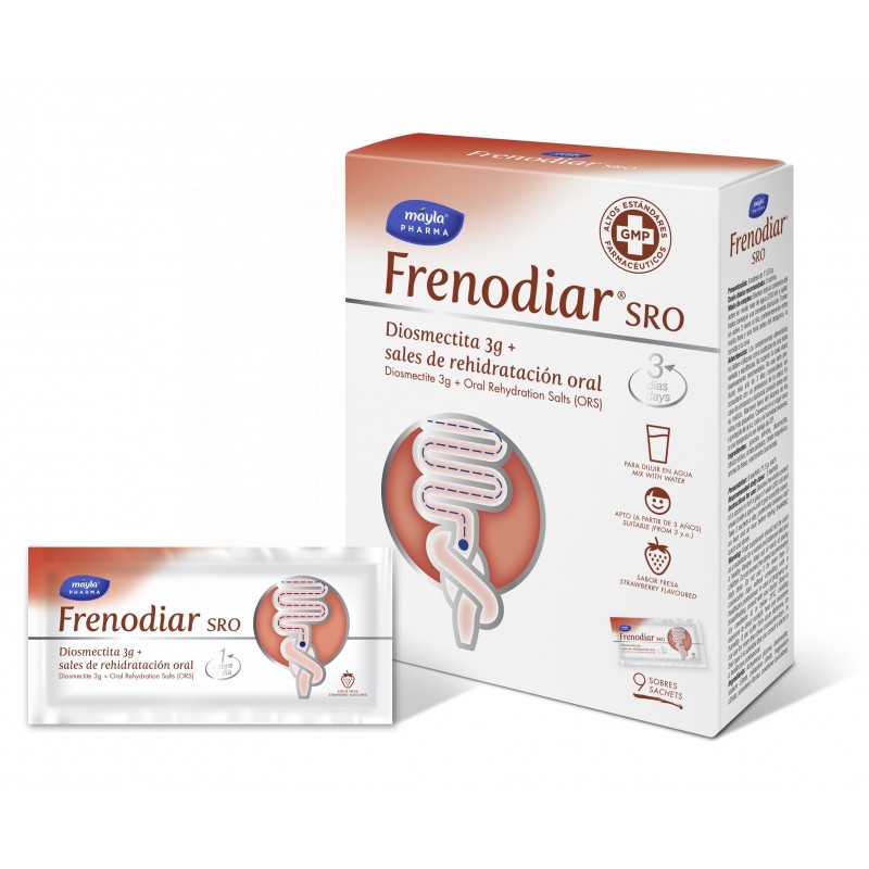 ¿TIENES DEPOSICIONES FLOJAS Y ACUOSAS?¿SIENTES LA NECESIDAD URGENTE DE DEFECAR?¿TIENES DOLOR ABDOMINAL (“RETORTIJONES”), NÁUSEAS, FIEBRE O VÓMITOS?SI HAS RESPONDIDO QUE SÍ A ALGUNAS DE ESTAS PREGUNTAS, DESDE MÁYLA® PHARMACEUTICASL TE RECOMENDAMOS FRENODIAR® SRO, ÚNICO TRATAMIENTO DE DOBLE ACCIÓN CON DIOSMECTITA, QUE FRENA LA DIARREA EN 3 DÍAS SIN ALTERAR LA MOTILIDAD INTESTINAL, E INCORPORA ELECTROLITOS, PARA PREVENIR LA DESHIDRATACIÓN POR PÉRDIDA DE LÍQUIDOS Y SALES QUE SE PRODUCEN DURANTE EL PROCESO DIARREICO.TOMAS 1 SOBRE DE FRENODIAR® SRO 3 VECES AL DÍA.TOMARLO PREFERENTEMENTE ENTRE MEDIA HORA Y UNA HORA ANTES DEL DESAYUNO, COMIDA Y CENA.DISOLVER TODO EL CONTENIDO EN MEDIO VASO DE AGUA (200 ML) Y AGITAR HASTA CONSEGUIR UNA COMPLETA DISOLUCIÓN.ESTE PRODUCTO PUEDE SER ADMINISTRADO A NIÑOS A PARTIR DE LOS 3 AÑOS.CONSERVA EL PRODUCTO EN UN AMBIENTE FRESCO Y SECO.INGREDIENTES ACTIVOSPOR 3 SOBRESDIOSMECTITA SODIOPOTASIOMAGNESIO 9000 MG4080 MG2400 MG600 MGCADA SOBRE DEBE SER ABIERTO INMEDIATAMENTE ANTES DE SU USO. NO REUTILICE SOBRE PARCIALMENTE USADOS.NO SUPERE LA DOSIS RECOMENDADA.NO SE RECOMIENDA EL USO DE ESTE PRODUCTO DURANTE MÁS DE 3 DÍAS CONSECUTIVOS SIN CONSULTAR CON UN PROFESIONAL DE LA SALUD.EN CASO DE EMBARAZO O LACTANCIA, CONSULTE CON SU MÉDICO ANTES DE CONSUMIR ESTE PRODUCTO. NO CONSUMA ESTE PRODUCTO EN POSICIÓN TUMBADA.NO TOME ESTE PRODUCTO DESPUÉS DE QUE PASE SU FECHA DE CADUCIDAD.NO TOME ESTE PRODUCTO SI SUFRE DE ESTREÑIMIENTO CRÓNICO U OBSTRUCCIÓN INTESTINAL.LOS COMPLEMENTOS ALIMENTICIOS NO DEBEN UTILIZARSE COMO SUSTITUTOS DE UNA DIETA VARIADA Y EQUILIBRADA. MANTENER.