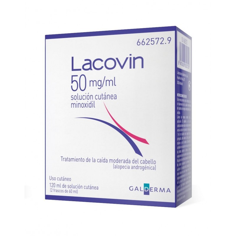 Lacovin 50mg/ml 2 Frascos 60 ml es una solución para uso externo que estimula el crecimiento del cabello en hombres con alopecia androgenética, el tipo de calvicie más habitual entre la población masculina.