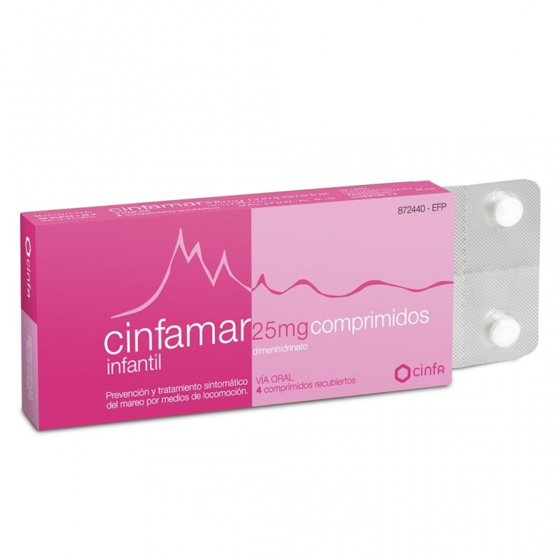 Cinfamar Infantil 25mg 4 Comprimidos contienen como principio activo, dimenhidrinato. Este compuesto actúa contra el mareo producido por los medios de transporte terrestre, marítimo y aéreo.