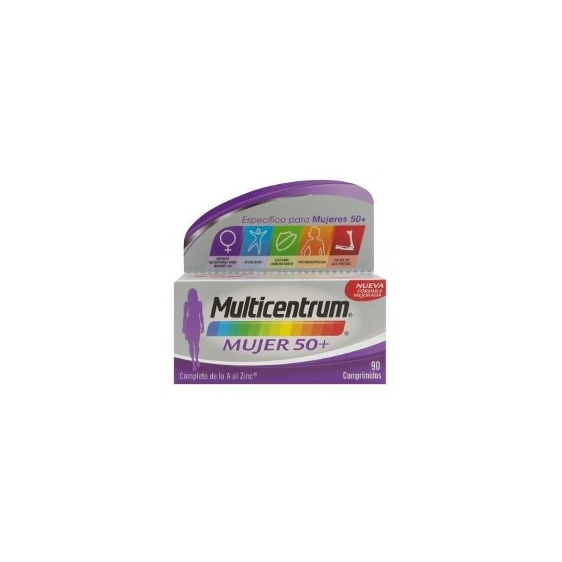 CON EL PASO DE LOS AÑOS SE ALTERA LA ABSORCIÓN Y EL METABOLISMO DE LOS NUTRIENTES EN EL ORGANISMO, PROVOCANDO UN CAMBIO EN LAS NECESIDADES ALIMENTICIAS.UN APORTE NUTRICIONAL CORRECTO DEBE SATISFACER LAS NECESIDADES ESPECÍFICAS EN VITAMINAS Y MINERALES DE LAS MUJERES MAYORES DE 50 AÑOS.LOS CAMBIOS DEBIDO A LA DISMINUCIÓN DE ESTRÓGENOS, TÍPICO EN LA MENOPAUSIA, PUEDEN CAUSAR:AUMENTO DE LA DEGRADACIÓN ÓSEAALTERACIÓN DE LA CONCENTRACIÓN Y LA MEMORIAIRRITABILIDAD Y CAMBIOS DE HUMORSEQUEDAD VAGINALLA FÓRMULA DE MULTICENTRUM MUJER 50+ CONTIENE:VITAMINA D Y CALCIO: SON NECESARIOS PARA EL MANTENIMIENTO DE LOS HUESOS EN CONDICIONES NORMALES.MANGANESO: CONTRIBUYE A LA FORMACIÓN NORMAL DEL TEJIDO CONECTIVO.MAGNESIO: CONTRIBUYE A LA FUNCIÓN PSICOLÓGICA NORMAL (LA CARENCIA ESTÁ ASOCIADA A SÍNTOMAS PSICOLÓGICOS, COMO LOS CAMBIOS EN LA PERSONALIDAD).VITAMINA A: CONTRIBUYE AL MANTENIMIENTO DE LA PIEL Y LAS MUCOSAS EN CONDICIONES NORMALES.COMPOSICIÓN POR UNIDADVITAMINA D 15 MICROGRAMOSCALCIO 340 MILIGRAMOSCOBRE 0.5 MILIGRAMOSCROMO 40 MICROGRAMOSFOSFORO 105 MILIGRAMOSHIERRO 4.2 MILIGRAMOSMAGNESIO 107 MILIGRAMOSMOLIBDENO 50 MICROGRAMOSSELENIO 30 MICROGRAMOSVITAMINA A 800 MICROGRAMOSVITAMINA B1 1.5 MILIGRAMOSVITAMINA B12 7.5 MICROGRAMOSVITAMINA B2 1.8 MILIGRAMOSVITAMINA B3 20 MILIGRAMOSVITAMINA B5 9 MILIGRAMOSVITAMINA B6 2.1 MILIGRAMOSVITAMINA B8 75 MICROGRAMOSVITAMINA B9 300 MICROGRAMOSVITAMINA C 80 MILIGRAMOSVITAMINA E 16 MILIGRAMOSVITAMINA K 30 MICROGRAMOSYODO 100 MICROGRAMOSZINC 5 MILIGRAMOSMODO DE EMPLEO TOMAR UN COMPRIMIDO AL DÍA. PRECAUCIONES Y ADVERTENCIAS LOS COMPLEMENTOS ALIMENTICIOS NO DEBEN UTILIZARSE COMO SUSTITUTOS DE UNA ALIMENTACIÓN VARIADA Y EQUILIBRADA Y UN MODO DE VIDA SANO. NO SUPERAR LA DOSIS DIARIA EXPRESAMENTE RECOMENDADA. MANTENER FUERA DEL ALCANCE DE LOS NIÑOS MÁS PEQUEÑOS. USO EN PACIENTES CON INTOLERANCIA ALIMENTARIA ESTE PRODUCTO LO PUEDE TOMAR UNA PERSONA CELÍACA, ALÉRGICA/INTOLERANTE AL HUEVO, ALÉRGICA A LA PROTEÍNA DE LECHE O INTOLERANTE A LA LACTOSA.PESO NETO: 49GRCOMERCIALIZADO POR GSK CH, CALLE SEVERO OCHOA, 2, TRES CANTOS, MADRID, 28760, ESPAÑA, 918070300