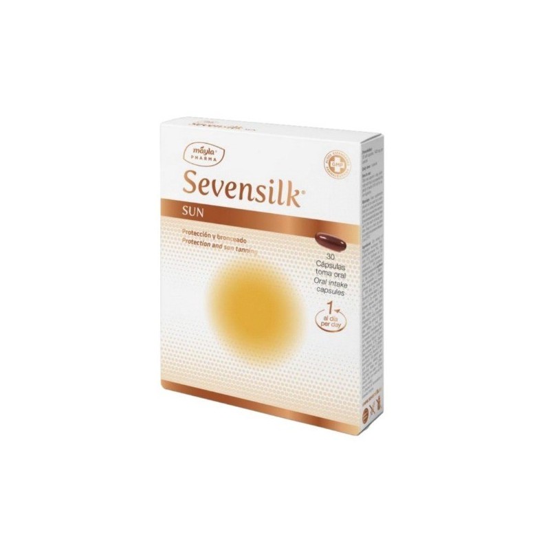 SEVENSILK® SUN ES UN NUTRICOSMÉTICO A BASE DE UN COMPLEJO ÚNICO QUE SE CONFORMA DE EXTRACTO DE POLYPODIUM LEUCOTOMOS, FRUTO DE AÇAÍ Y BETACAROTENOS DE BLAKESLEA TRISPORA QUE, JUNTOS, AYUDAN A PREPARAR LA PIEL FRENTE A LA EXPOSICIÓN SOLAR, REFORZÁNDOLA, ESTIMULÁNDOLA Y CONTRIBUYENDO A BLOQUEAR EL DAÑO DE LOS RADICALES LIBRES PRODUCIDOS POR LOS RAYOS UV.IDEAL COMO COMPLEMENTO A LAS CREMAS SOLARES PORQUE AYUDA A OBTENER UNA PROTECCIÓN DESDE EL INTERIOR MÁS COMPLETA Y PROFUNDA MIENTRAS DISFRUTAMOS PLENAMENTE DEL SOL.SU FÓRMULA ADEMÁS INCORPORA OTROS INGREDIENTES ACTIVOS Y VITAMINAS ESPECÍFICAS QUE CONTRIBUYEN A LA ÓPTIMA PROTECCIÓN DE LAS CÉLULAS CONTRA EL ESTRÉS OXIDATIVO, PROPORCIONANDO ASÍ UN BRONCEADO NATURAL Y DURADERO.LA COMPLEJA FÓRMULA TAMBIÉN CONTRIBUYE A PREVENIR EL FOTO-ENVEJECIMIENTO, EVITAR LA APARICIÓN DE MANCHAS Y REACCIONES INFLAMATORIAS A CONSECUENCIA DE LAS RADIACIONES SOLARES.INDICACIONESINDICADO PARA PREPARAR TU PIEL FRENTE A LA RADIACIÓN SOLAR PREVINIENDO EL DAÑO QUE CAUSAN LOS RADICALES LIBRES Y CONSEGUIR UN BRONCEADO UNIFORME, NATURAL Y DURADERO. INDICADO TAMBIÉN PARA PERSONAS QUE TOMAN UNA MEDICACIÓN FOTOSENSIBLE Y NECESITAN UNA PROTECCIÓN MÁS COMPLETA PARA EVITAR REACCIONES. MODO DE EMPLEOTOMAR UNA CÁPSULA AL DÍA, PREFERENTEMENTE CON ALGO DE COMIDA, ACOMPAÑADA DE ABUNDANTE AGUA PARA FACILITAR SU INGESTIÓN. COMPOSICIÓNEXT. SECO DE POLYPODIUM LEUCOTOMOS 300 MG, EXT. SECO DE TOMATE 116,5 MG, ACEITE DE ESPINO AMARILLO 50 MG, ACEITE DE ONAGRA 50 MG, EXT. SECO DE BARDANA 300 MG, EXT. SECO DE AÇAI 50 MG, EXT. SECO DE UVA 25 MG, RESVERATROL 24,5 MG, VITAMINA E 12 MG, BETA-CAROTENO 4 MG, VITAMINA B2 1,4 MG, VITAMINA D3 5 G.