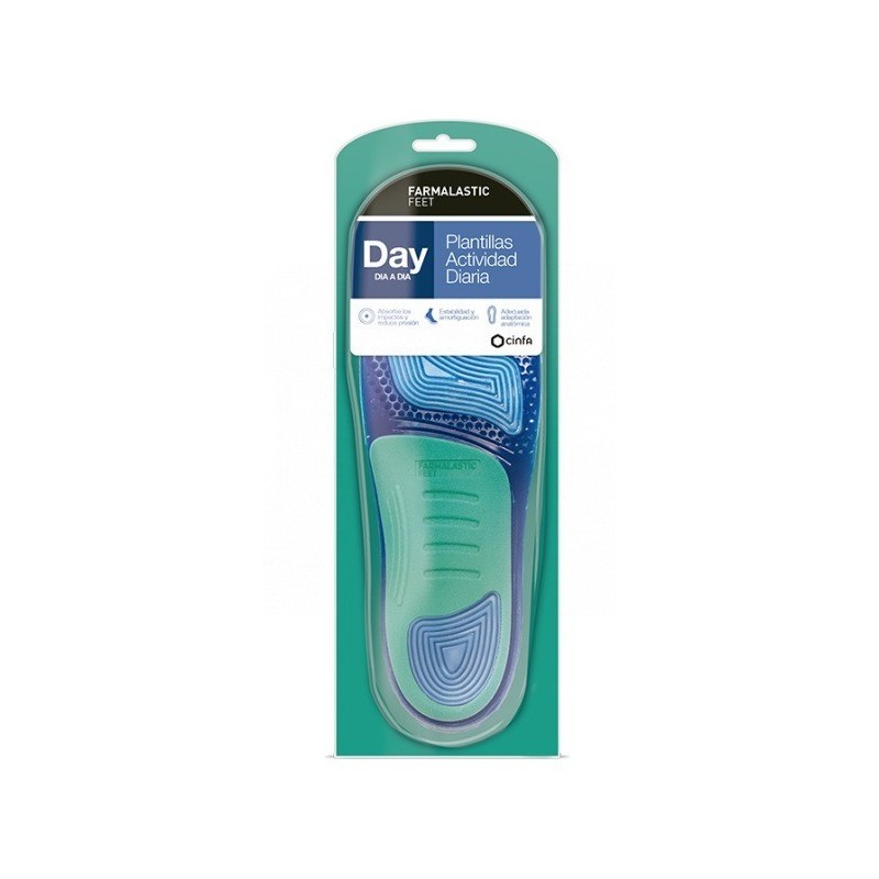 PARA USAR TODOS LOS DÍAS AL CAMINAR Y REALIZAR LAS ACTIVIDADES COTIDIANAS. PARA REDUCIR LA PRESIÓN QUE SUFREN LOS PIES POR EL CALZADO HABITUAL Y SENTIRSE CÓMODO Y DESCANSADO A LO LARGO DEL DÍA. LAS PLANTILLAS DAY DE FARMALASTIC FEET AYUDAN A ABSORBER LOS IMPACTOS DE FORMA EFICAZ Y A REDUCIR LA PRESIÓN QUE LOS PIES SOPORTAN A LO LARGO DEL DÍA. ADEMÁS DE AYUDAR A PROPORCIONAR MAYOR ESTABILIDAD Y SOPORTE EN EL ARCO PLANTAR Y AMORTIGUACIÓN EN METATARSO Y TALÓN. SU SISTEMA DE TALLAJE Y AJUSTE PERMITEN UNA ADECUADA ADAPTACIÓN ANATÓMICA DE CADA TALLA AL NÚMERO DE CALZADO. PUEDEN UTILIZARSE CON EL CALZADO HABITUAL. MODO DE EMPLEO PARA UNA ADECUADA COLOCACIÓN, QUITAR LA PLANTILLA QUE ACTUALMENTE LLEVA EL CALZADO. CORTAR LA PLANTILLA FARMALASTIC FEET SIGUIENDO LA GUÍA DE TALLAS. INTRODUCIR LA PLANTILLA EN EL ZAPATO CON LA SUELA TEXTIL HACIA ARRIBA. PRECAUCIONES Y ADVERTENCIAS ESTAS PLANTILLAS NO ESTÁN INDICADAS PARA EL TRATAMIENTO DE LAS PATOLOGÍAS DEL PIE, LOS PROBLEMAS DE PISADA Y LA CORRECCIÓN DE POSTURAS INADECUADAS, Y NO DEBEN SER USADAS AL MISMO TIEMPO QUE LAS ORTOPÉDICAS. PARA LIMPIAR LA PLANTILLA PASAR UN TRAPO HÚMEDO CON AGUA TIBIA Y JABÓN NEUTRO. RECOMENDAMOS CAMBIAR LAS PLANTILLAS CADA 4-6 MESES.