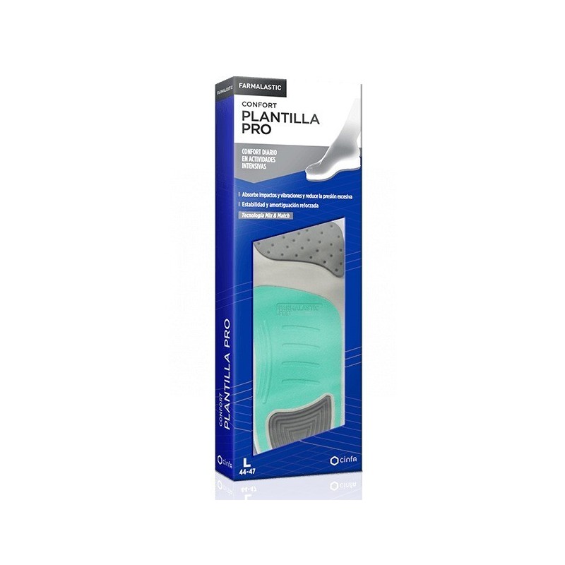 Las plantillas PRO de Farmalastic están desarrolladas en Tecnología Mix and Match con PU (Poliuretano) y Doble Gel TPE (Thermoplastic Elastomer) que ayuda a absorber los impactos y vibraciones de forma eficaz y a reducir la presión excesiva que los pies soportan en actividades intensivas. Ayudan a proporcionar de forma reforzada mayor estabilidad y soporte en el arco plantar y amortiguación en metatarso y talón. Su sistema de tallaje y ajuste permiten una adecuada adaptación anatómica de cada talla al número de calzado. Pueden utilizarse con el calzado habitual, deportivo o de trabajo.