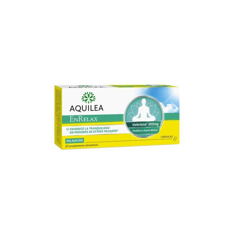 GRACIAS A SU FÓRMULA CON EXTRACTOS NATURALES FAVORECE LA TRANQUILIDAD Y LA CALMA EN PERIODOS DE ESTRÉS PASAJERO. EL ESTRÉS PASAJERO SE PUEDE PADECER DURANTE UN PERIODO DE TIEMPO MÁS PROLONGADO Y ESTÁ OCASIONADO POR SITUACIONES DIARIAS RELACIONADAS CON EL TRABAJO, LA FAMILIA Y OTRAS RESPONSABILIDADES.AQUILEA ENRELAX FACILITA LA RELAJACIÓN, GRACIAS A LA COMBINACIÓN DE SUS INGREDIENTES ACTIVOS COMO VALERIANA, PASIFLORA Y ESPINO BLANCO.LA VALERIANA: ES LA PLANTA IDEAL PARA TODA PERSONA SOMETIDA A PERIODOS DE ESTRÉS.PASIFLORA: LA PASIFLORA ES UNA DE LAS PLANTAS MÁS UTILIZADAS PARA MANTENER LA ACTIVIDAD MENTAL DURANTE PERIODOS DE ESTRÉS.ESPINO BLANCO: ES LA PLANTA IDEAL PARA TODA PERSONA SOMETIDA A PERIODOS DE ESTRÉS Y RITMOS DE VIDA ACELERADO, YA QUE AYUDA A TRANQUILIZAR.COMPOSICIÓNPOR 1 CAPSÚLA: VALERIANA (100 MG), PASIFLORA (100 MG), ESPINO BLANCO ( 100 MG).LOS COMPLEMENTOS ALIMENTICIOS NO DEBEN UTILIZARSE COMO SUSTITUTOS DE UNA DIETA VARIADA Y EQUILIBRADA Y DE UN MODO DE VIDA SANO. NO SOBREPASAR LA CANTIDAD DIARIA RECOMENDADA. CONSERVAR EN UN LUGAR FRESCO Y SECO, PROTEGIDO DE LA LUZ SOLAR. MANTENER FUERA DEL ALCANCE DE LOS NIÑOS MÁS PEQUEÑOS. NO ADMINISTRAR A NIÑOS MENORES DE 12 AÑOS.