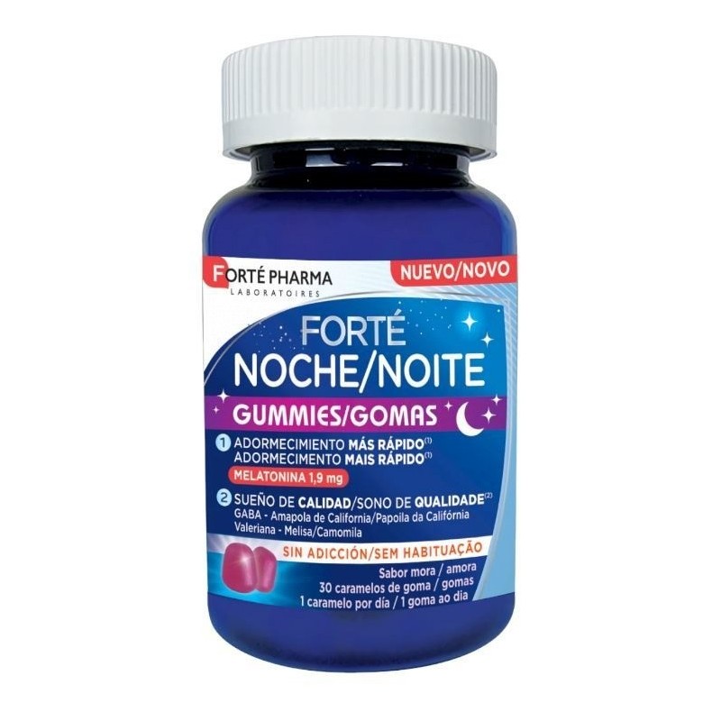 FORTÉ NOCHE GUMMIES ES UN COMPLEMENTO ALIMENTICIO CON UN DOBLE EFECTO:1. GRACIAS A LA MELATONINA EN ALTA DOSIS (1,9 MG) CONTRIBUYE A DISMINUIR EL TIEMPO NECESARIO PARA CONCILIAR EL SUEÑO(1).2. LA AMAPOLA DE CALIFORNIA AYUDA A REDUCIR LOS DESPERTARES NOCTURNOS Y FAVORECE EL SUEÑO(2).LA FÓRMULA SE COMPLEMENTA CON EL NEUROMEDIADOR GABA (ÁCIDO GAMAAMINOBUTÍRICO) NATURALMENTE PRESENTE EN EL ORGANISMO Y CON LA VALERIANA, MELISA Y TILA. UN FORMATO PRÁCTICO, NO NECESITA AGUA, CON AGRADABLE SABORNA MORA.ALEGACIONES:(1)LA MELATONINA CONTRIBUYE A DISMINUIR EL TIEMPO NECESARIO PARA CONCILIAR EL SUEÑO CON UN CONSUMO DE 1 MG (1000 ΜG) DE MELATONINA ANTES DE IRSE A DORMIR.(2)LA AMAPOLA DE CALIFORNIA MEJORA LA CALIDAD DEL SUEÑO.SIN GLUTEN. SIN LACTOSA. SIN HUEVO. SIN SOJA. SIN FENILALANINA. SIN AZÚCARES AÑADIDOS.TOMAR MÁXIMO 1 CARAMELO DE GOMA AL DÍA, POR LA NOCHE, MEDIA HORA ANTES DE ACOSTARSE.INGREDIENTES (POR DOSIS DIARIA): FRUCTOOLIGOSACÁRIDOS, AGUA, AGENTE GELIFICANTE (PECTINA), EXTRACTO DE AMAPOLA DE CALIFORNIA (ESCHSCHOLZIA CALIFORNICA CHAM.) (50 MG O 150 MG EQUIVALENTE EN PLANTA), ACIDIFICANTE (ÁCIDO CÍTRICO), EXTRACTO DE VALERIANA (VALERIANA OFFICINALIS L.) (25 MG O 75 MG EQUIVALENTE EN PLANTA), ÁCIDO GAMMA-AMINOBUTÍRICO (20 MG), EXTRACTO DE MELISA (MELISSA OFFICINALIS L.) (40 MG EQUIVALENTE EN PLANTA), EXTRACTO DE TILA DE HOJA PEQUEÑA (TILIA CORDATA MILL.) (40 MG EQUIVALENTE EN PLANTA), COLORANTE (ANTOCIANINAS), CORRECTOR DE LA ACIDEZ (CITRATO TRISÓDICO), ACEITE VEGETAL, AROMA NATURAL, MELATONINA (1,9 MG), ANTIAGLOMERANTE (CERA DE CARNAUBA.LOS COMPLEMENTOS ALIMENTICIOS NO DEBEN UTILIZARSE COMO SUSTITUTO DE UNA DIETA VARIADA Y EQUILIBRADA Y UN MODO DE VIDA SALUDABLE. ESTE PRODUCTO DEBE MANTENERSE FUERA DE LA VISTA Y DEL ALCANCE DE LOS NIÑOS. NO SOBREPASE LA DOSIS DIARIA RECOMENDADA. NO SUMINISTRAR EN MUJERES EMBARAZADAS O EN PERIODO DE LACTANCIA NI MENORES DE 12 AÑOS SIN PREVIO AVISO MÉDICO. NO CONDUCIR UN VEHÍCULO O UTILIZAR UNA MÁQUINA DURANTE LAS 4 O 5 HORAS POSTERIORES A LA TOMA DE MELATONINA. ESTE COMPLEMENTO ALIMENTICIO NO ES UN MEDICAMENTO. EN CASO DE TOMA DE MEDICAMENTOS (ANTIDEPRESIVOS, SOMNÍFEROS U OTROS SEDANTES, ETC), NO TOMAR SIN PREVIO AVISO MÉDICO. DESACONSEJADO USO PROLONGADO.AS.
