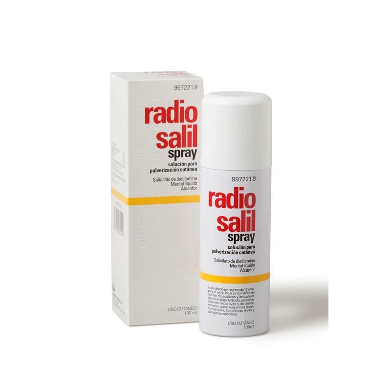 Radio Salil Spray 130ml es una solución para pulverización cutánea, que está indicada en mayores de 12 años para el alivio local sintomático de dolores musculares y articulares como: lumbago, tortícolis o pequeñas lesiones deportivas y de sobreesfuerzo.