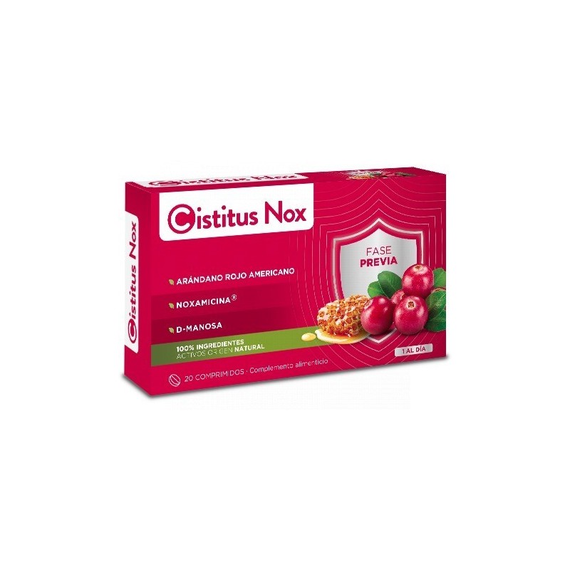 EL MALESTAR DEL TRACTO URINARIO PUEDE ESTAR CAUSADO HABITUALMENTE POR LA BACTERIA ESCHERICHIA COLI (E. COLI) PROCEDENTE DEL INTESTINO, SU HÁBITAT NATURAL. CUANDO DICHAS BACTERIAS, QUE SE ALOJAN EN EL INTESTINO, CONSIGUEN LLEGAR A LA URETRA Y A LA VEJIGA, PUEDEN ESTABLECERSE Y PRODUCIR MOLESTIAS. LAS MUJERES TIENDEN A PADECERLO CON MAYOR FRECUENCIA QUE LOS HOMBRES, DEBIDO A QUE ANATÓMICAMENTE SU URETRA TIENE UN RECORRIDO MÁS CORTO.CISTITUS NOX® TE AYUDA A TOMAR EL CONTROL GRACIAS A SU FORMULA SINÉRGICA A BASE DE NOXAMICINA®, ARÁNDANO ROJO AMERICANO Y D-MANOSA.COMPOSICIÓN- ARÁNDANO ROJO AMERICANO 90 MG- PROANTOCIANIDINAS 72 MG- NOXAMICINA® 50 MG- D- MANOSA 500 MGLOS COMPLEMENTOS ALIMENTICIOS NO DEBEN UTILIZARSE COMO SUSTITUTOS DE UNA DIETA VARIADA Y EQUILIBRADA Y DE UN MODO DE VIDA SANO. NO SOBREPASAR LA CANTIDAD DIARIA RECOMENDADA. CONSERVAR EN LUGAR FRESCO Y SECO, PROTEGIDO DE LA LUZ SOLAR. MANTENER FUERA DEL ALCANCE DE LOS NIÑOS MÁS PEQUEÑOS.